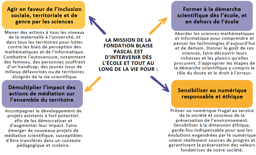 Accompagner le développement de projets sur tout le territoire, dans toutes les géographies et pour tous les publics. Participer pleinement à la naissance de citoyennes et citoyens curieux, éclairés et responsables, capables de raisonner et de faire preuve d’abstraction et d’esprit critique.